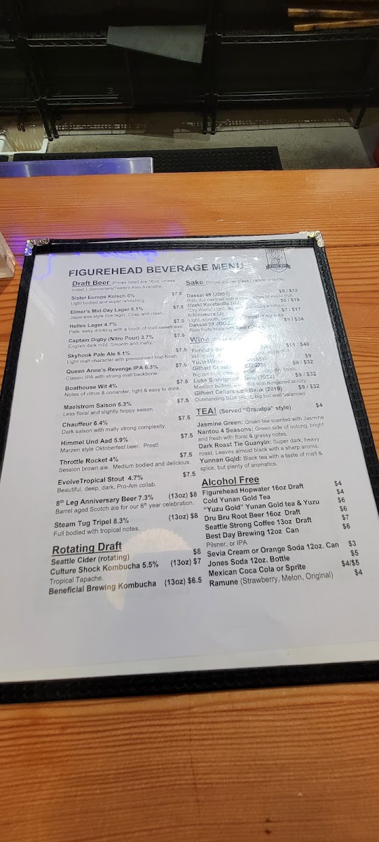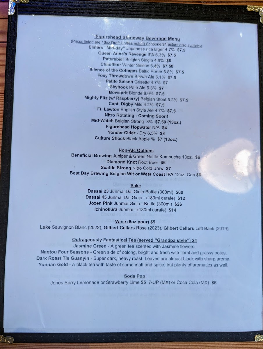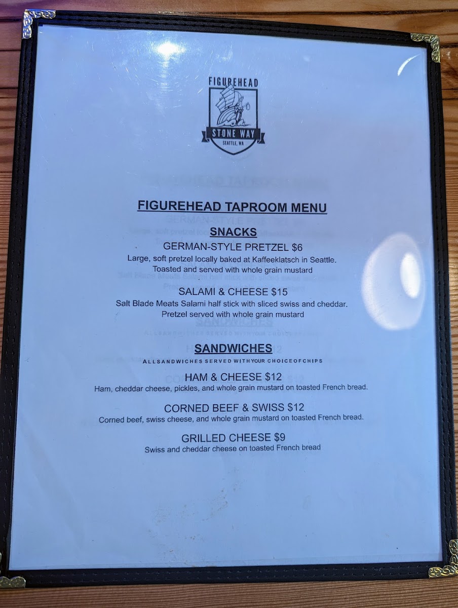 From a reviewer’s perspective, the menu at Figurehead Stone Way strikes a pleasing balance between simplicity and thoughtful variety, with approachable bites and a strong beverage program. The sandwich lineup-Ham & Cheese, Corned Beef & Swiss, and Grilled Cheese-keeps things classic and satisfying, pairing naturally with an extensive draft list that ranges from Sister Europe Kolsch 5 and Elmer's Mid-Day Lager 5.1 to the smooth Captain Digby (Nitro Pour) 3.7 and hop-forward Skyhook Pale Ale 5.1. For something different, the sake selections like Dassai 45 and Ozeki Karatanba add a refined touch, while alcohol-free options such as Figurehead Hopwater 16oz Draft, Dru Bru Root Beer 16oz Draft, and Seattle Strong Coffee 13oz Draft ensure inclusivity without sacrificing flavor. The rotating taps-Culture Shock Kombucha 5.5 and others-keep things fresh, and the ramen offerings like Hiroshima Onomichi and Kumamoto Miso Bold provide heartier fare. Complemented by snacks like the German-Style Pretzel and Salami & Cheese, the menu feels cohesive yet flexible, making it an easy choice whether you’re after a quick bite or a relaxed drink with something comforting on the side.
